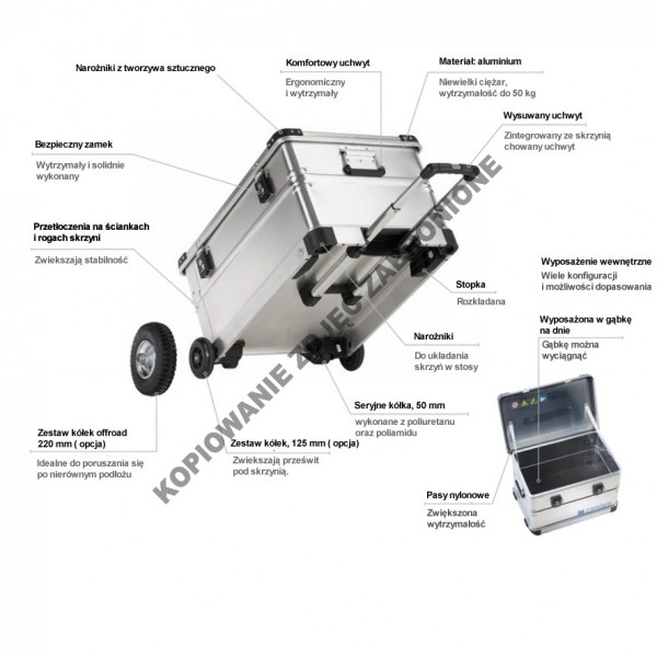 - Opcjonalnie skrzynie można wyposażyć w większe koła: 125 mm /dopłata 400 zł + VAT/.