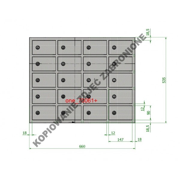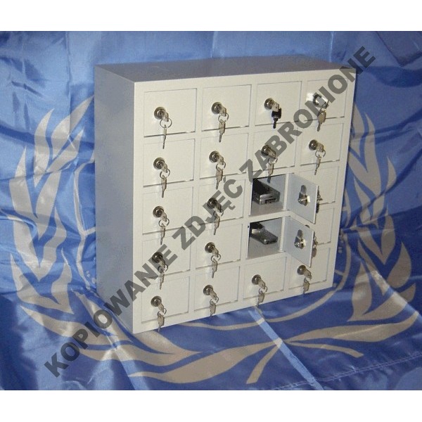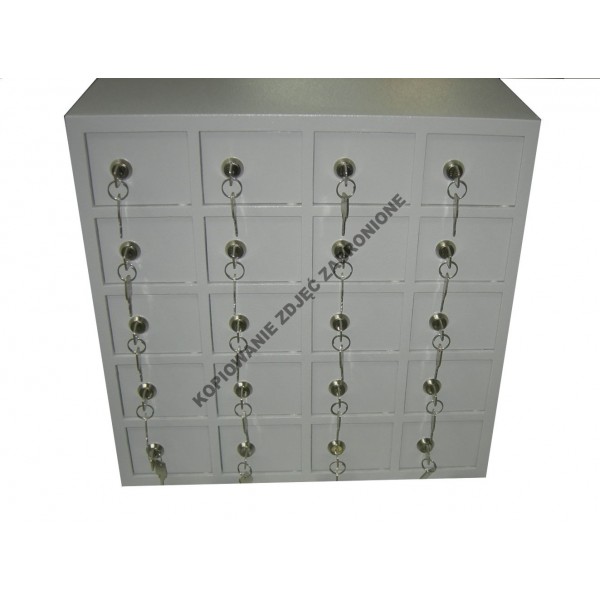 Posiada 20 skrytek zamykanych na zamek mechaniczny /2 kluczyki w komplecie do każdej skrytki/. Korpus wykonany z blachy 3 mm, blaty drzwi 3 mm. Kolor jasnoszary - lakier proszkowy. 4 otwory w ścianie tylnej do zamocowania wraz z elementami mocującymi.