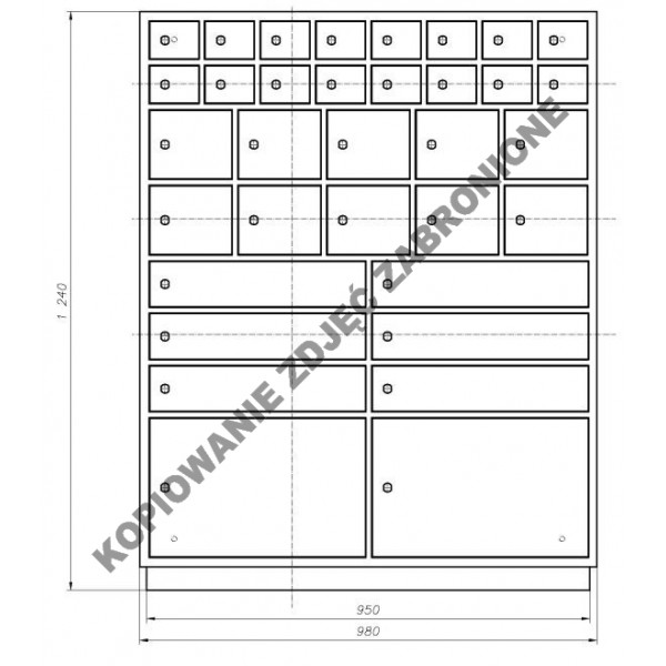Urządzenie służące do deponowania telefonów komórkowych, laptopów, broni, kamer i ponadgabarytowych przedmiotów. Stosowane jest w miejscach objętych zwiększonym nadzorem i o podwyższonym poziomie bezpieczeństwa; przed wejściami do: stref bezpieczeństwa, kancelarii tajnych, sal odpraw i narad, na portierniach. Posiada skrytki o następujących wymiarach wewnętrznych: - 16 skrytek...