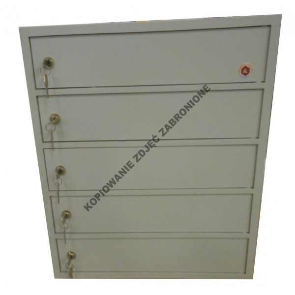 Urządzenie służące do przechowywania komputerów osobistych (laptop, notebook). Posiada 5 skrytek zamykanych na zamek mechaniczny cylindryczny /2 kluczyki w komplecie do każdej skrytki/. Korpus wykonany z blachy 3 mm, blaty drzwi 3 mm. Drzwi skrytek otwierane na prawą stronę.