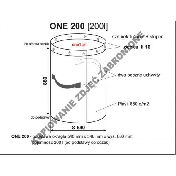 Podstawa okrągła 540 mm x 540 mm x wys. 880 mm, pojemność 200 l (od podstawy do oczek).