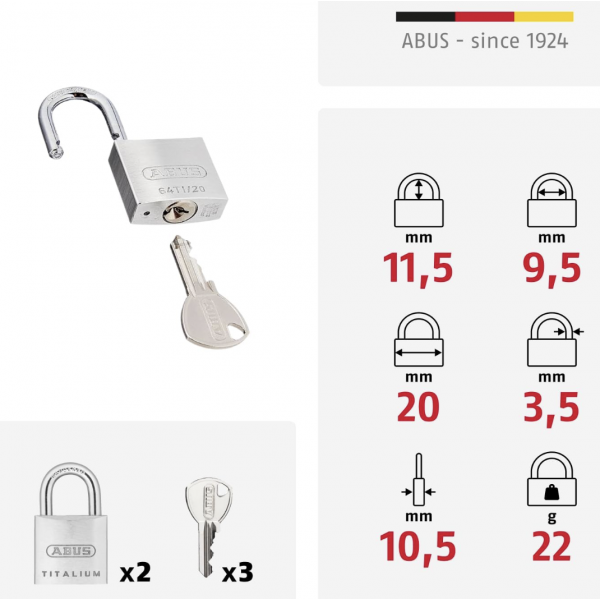Kłódka dedykowana do zamykania skrzyń, walizek, toreb podróżnych itp. - Mocny korpus wykonany ze specjalnego aluminium TITALIUM™,. - Wysokie bezpieczeństwo przy zredukowanej wadze. - Hartowane jarzmo stalowe zabezpieczone przed korozją przy użyciu nanotechnologii. - Paracentryczny profil klucza ze zwiększoną odpornością na manipulację. - Precyzyjny zamek zastawkowy, jarzmo ryglowane...
