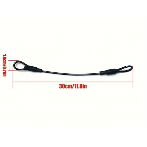 Linka zabezpieczająca 30cm Wytrzymała linka wykonana ze stali nierdzewnej, całkowicie pokryta PCV: - średnica linki 3 mm, - długość ok. 30 cm, - średnica oczka ok. 1,8 cm. Wykorzystywana głównie do zabezpieczenia rzeczy pozostawionych na zewnątrz np. jako zabezpieczenie kasku motocyklowego, torby, plecaka itp. Może być stosowana w komplecie z kłódką szyfrową walizkową.