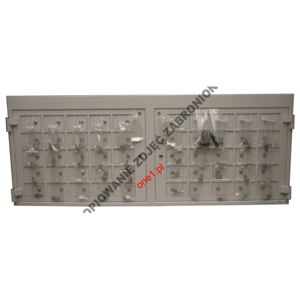 Urządzenie służące do przechowywania kluczy oraz małych przedmiotów (karty bankowe, dokumenty) w plombowanych metalowych pojemnikach. Stosowane jest w miejscach objętych podwyższonym poziomem bezpieczeństwa. Posiada 50 skrytek zamykanych na zamek mechaniczny /2 kluczyki w komplecie do każdej skrytki/. Dodatkowo fronty główne otwierane jednym kluczem administratora /zamek dwuzabierakowy - certyfikowany/ pozwalający na ogólny dostęp do wszystkich pojemników. Standardowo wyposażony w sygnalizację elektroniczną /czujnik w każdej skrytce/ informującą czy pojemnik znajduje się w środku. Nad skrytkami panel kontrolny /diodowy/ sygnalizujący o zawartości poszczególnych skrytek. W komplecie 50 metalowych pojemników na klucze z możliwością plombowania. Korpus wykonany z blachy 3 mm, blaty drzwi 3 mm. Kolor jasnoszary - lakier proszkowy. 4 otwory w ścianie tylnej do zamocowania wraz z elementami mocującymi.