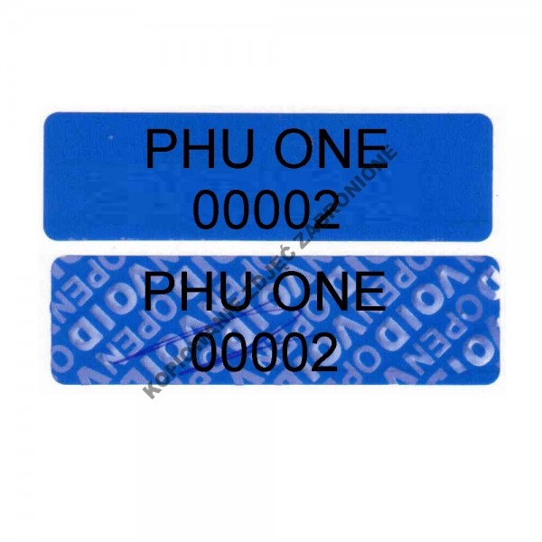 Po zerwaniu rozwarstwia się, ale nie brudzi klejem powierzchni plombowanej - na plombie pojawia się napis "VOID OPEN". Stosowana głównie do plombowania drzwi. Dowolny napis i numeracja w cenie.