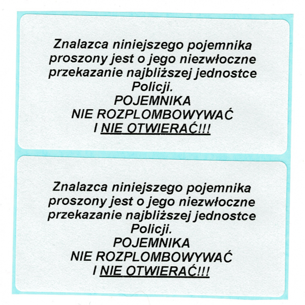 Etykiety termiczne o rozmiarze 80mm x 40mm. Posiadają mocny klej, są odporne na alkohol, wodę i tłuszcz. Zgodnie z obowiązującymi przepisami przeznaczone do oklejania przesyłek niejawnych podczas ich transportu i ewakuacji. Wskazane jest naklejenie jej na rewersie zawieszki ewakuacyjnej-kontrolki. Na każdej etykiecie wydrukowany jest napis: „Znalazca niniejszego pojemnika proszony jest...