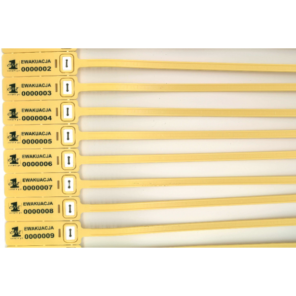 Numerowana plomba wykonana z kopolimeru polipropylenu, dedykowana do zabezpieczania worków. - metalowy zamek zapewnia odporność na manipulacje i wysoki stopień bezpieczeństwa - plomba zaciskowa o długości całkowitej 420 mm - przekrój 2,2 mm x 7,5 mm - unikatowa metalowa komora plombująca - siła zrywająca 400 N - zakres temperatur od -20 0C do +80 0C - magazynowy kolor - żółty...