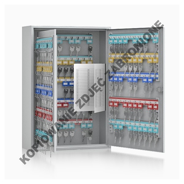 Korpus szafki jednościankowy z wpuszczonymi drzwiami, dodatkowo ścianka ruchoma. Listwy hakowe przestawiane, kolorowe, numerowane. Drzwi zamykane zamkiem cylindrycznym. W ścianie tylnej są 4 otwory do mocowania. Wymiary (WxSxG): 550x380x140 Ilość haków: 150, waga: 13 kg Towar na zamówienie. Okres oczekiwania ok. 4 tygodnie. Wersja z możliwością plombowania za pomocą...