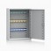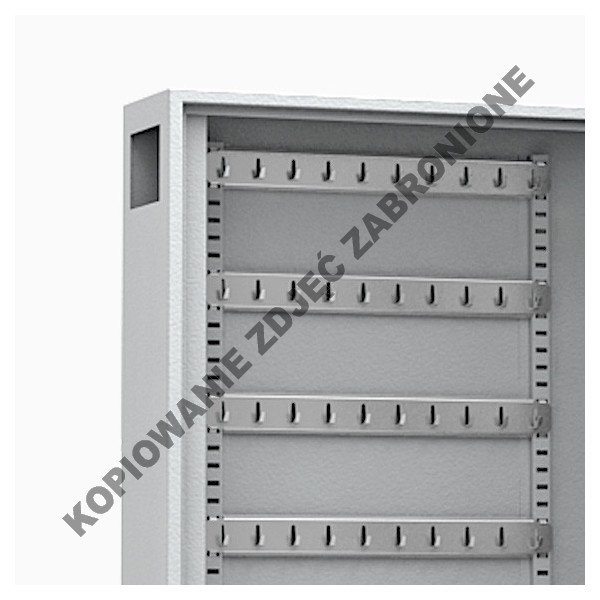 Korpus szafki jednościankowy z wpuszczonymi drzwiami, dodatkowo ścianka ruchoma. Listwy hakowe przestawiane, kolorowe, numerowane. Z boku szczelina wrzutowa na klucze. Drzwi zamykane zamkiem cylindrycznym. W ścianie tylnej są 4 otwory do mocowania. Wymiary (WxSxG): 350x270x80 Ilość haków: 21, waga: 3 kg