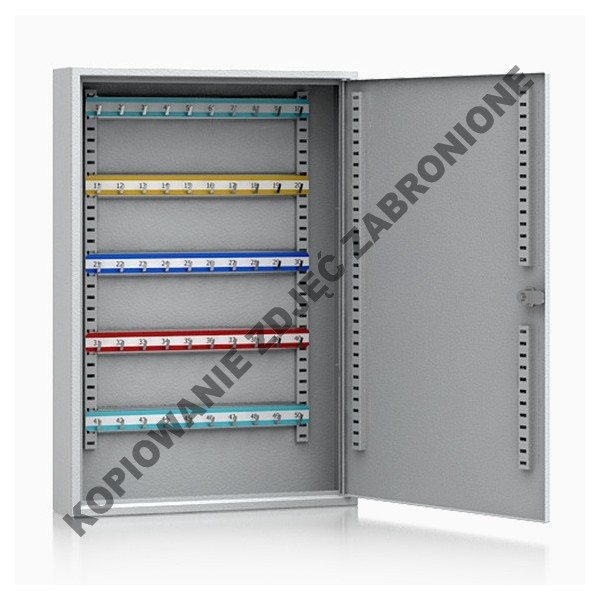 Korpus szafki jednościankowy z wpuszczonymi drzwiami, dodatkowo ścianka ruchoma. Listwy hakowe przestawiane, kolorowe, numerowane. Z boku szczelina wrzutowa na klucze. Drzwi zamykane zamkiem cylindrycznym. W ścianie tylnej są 4 otwory do mocowania. Wymiary (WxSxG): 550x380x80 Ilość haków: 50, waga: 6 kg Towar na zamówienie. Okres oczekiwania ok. 4 tygodnie. Wersja z możliwością...