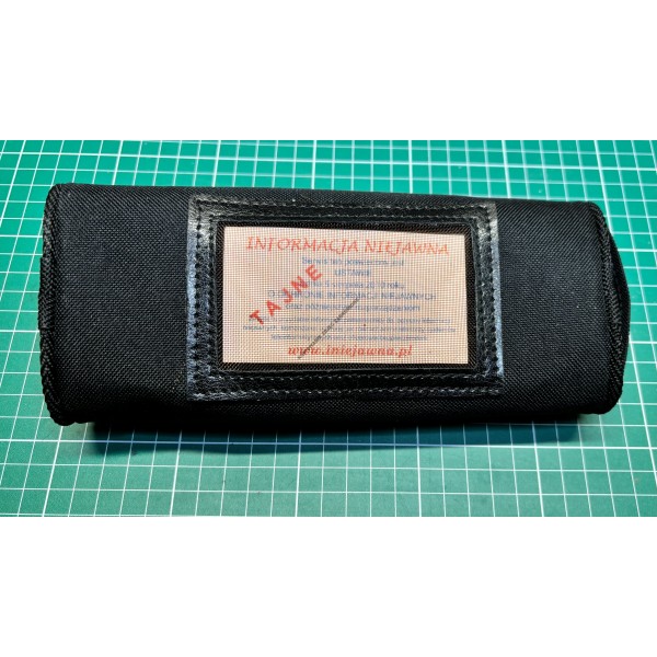 Elegancka torebka depozytowa na klucze, karty, gotówkę itp. Wykonana z kodury koloru czarnego. Bardzo wytrzymała. Zaopatrzona w okienko identyfikacyjne oraz 2 uchwyty do zawieszenia. Zamykana na suwak. Kształtem przypomina tradycyjny piórnik. Przystosowana do plombowania za pomocą referentki. Wymiary: 90x50x200mm /SxWxG/.