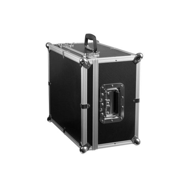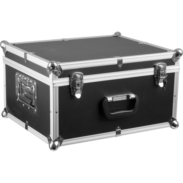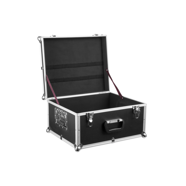 Kufer transportowy wykonany z aluminium, płyty drewniano-pilśniowej, tworzywa sztucznego. Wnętrze wyłożone miękką pianką poliuretanową. Zamykany dwoma uchwytami zaczepowymi wyposażonymi w zamki kluczowe. Po bokach dwa składane uchwyty transportowe oraz jeden dodatkowy na czole walizki. Cała konstrukcja jest wyposażona w metalowe obicia na rogach w postaci stalowych kul. –...